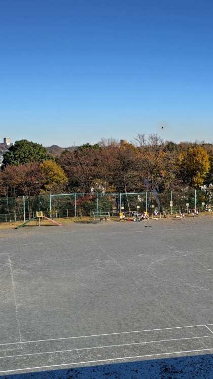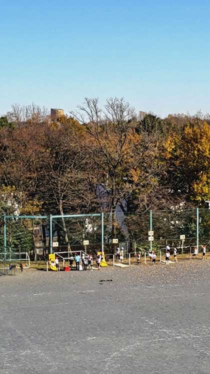 (青空の下、校庭の奥では3年生が鉄棒をしています)