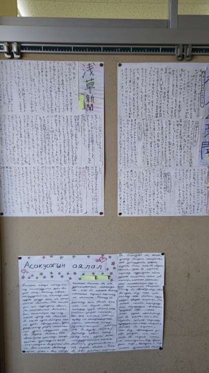 (でき上がったものは掲示されています。大判画用紙にペン書きで仕上げられた新聞はとても迫力があります)