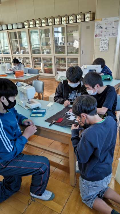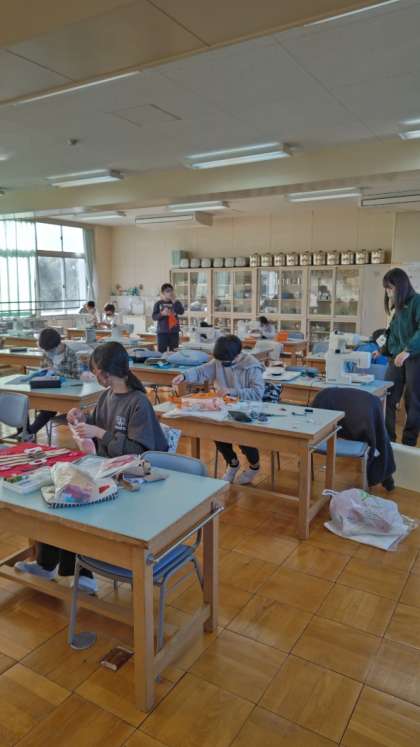[6年生家庭]ミシンを使ってクッションづくりです。色とりどりの布を使って取り組んでいます。