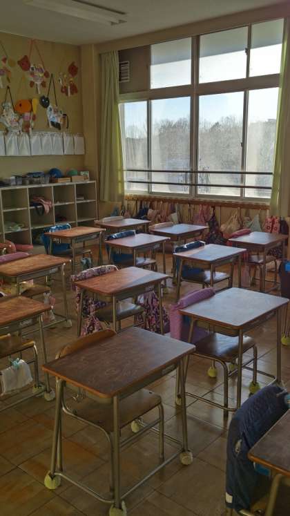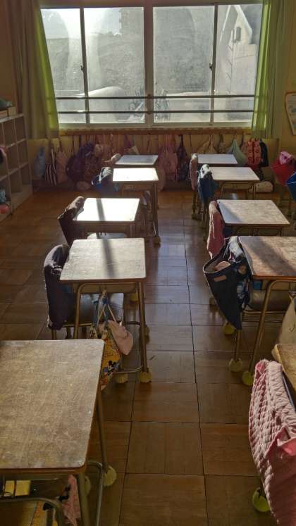子供たちの登校前です。教室の机が冬の朝日に照らされて光っています。今日もかなり冷え込んだ朝になりました。