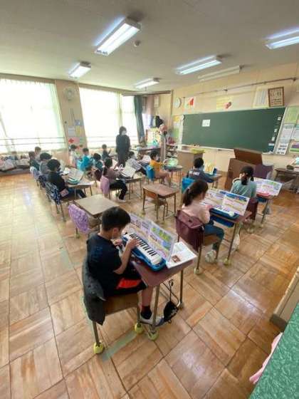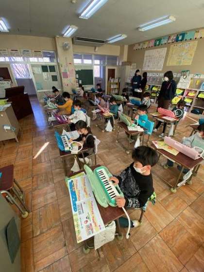 鍵盤ハーモニカで「かえるの合唱」を演奏していました。