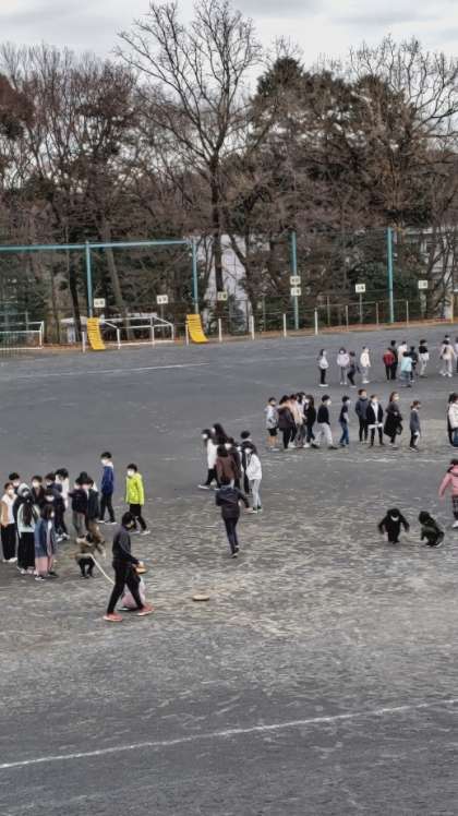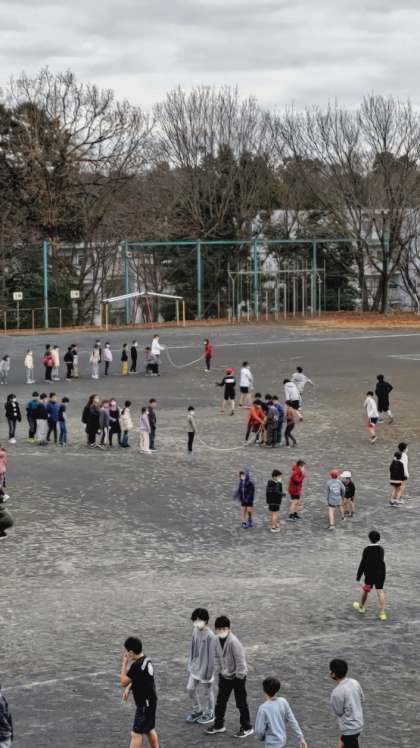 中休みのチャイムと同時に、子供たちが元気に校庭に出てきました。各クラスごとに大縄跳びの形をつくります。さあがんばりましょう!