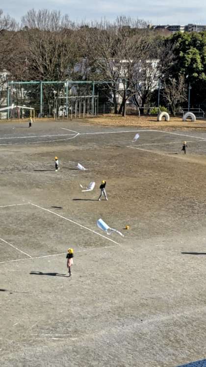 [1年生生活]広い校庭で1年生が手作り凧を飛ばしています。私も子供の頃はもちろん、担任の頃も、凧揚げはよくやりましたが、今はできる場所があまりありませんよね。