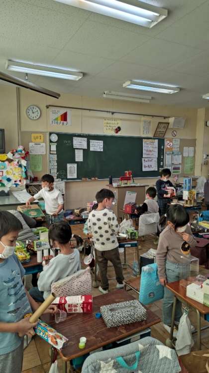 [1年生図工]「はこでつくったよ」です。箱を並べたり積んだり、いろいろ組み合わせて、思いついたものを作ります。