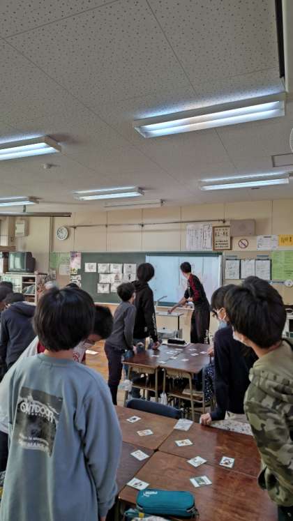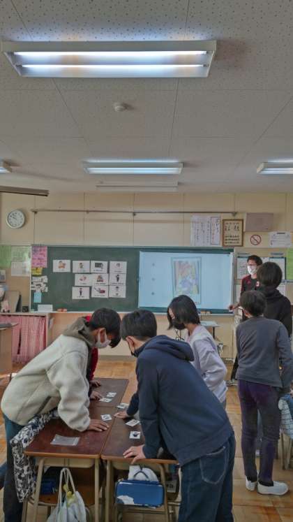 [6年生外国語]6年生が机を合わせて向き合っています。カルタをするようです。英語で「お仕事のカルタ」を用意しました。