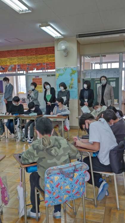 (たくさんの先生たちが見守る中、自分たちの話合いを振り返ります)