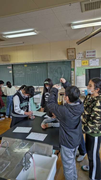 (水50mlを入れたビーカーに、計量スプーンで食塩を1杯ずつ入れて溶かしていきます)
