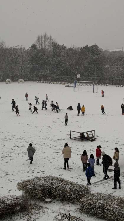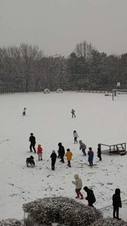 久しぶりの雪景色の校庭です。広い校庭です。思う存分に雪遊びをしてください。副校長先生が「校庭で遊びたい人は、気を付けて遊んでください」と放送すると校舎内で歓声があがりました。