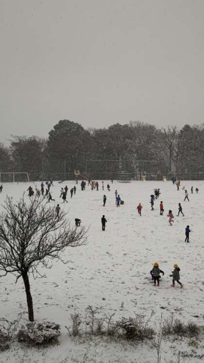 (中休み、先生たちも一緒になって雪合戦をしています。やっぱり先生が一番狙われています)