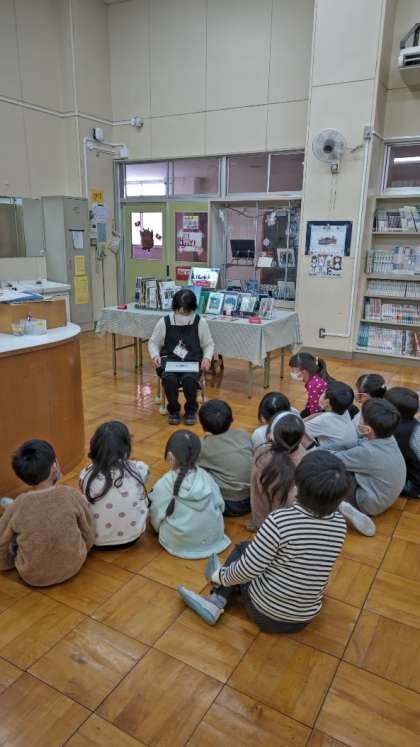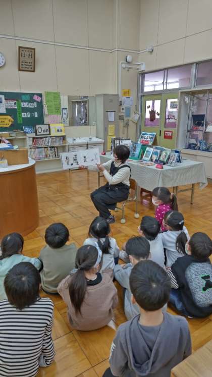 [1年生国語図書]今日は金曜日、学校司書の先生がいる日です。1年生が読み聞かせをしてもらっています。