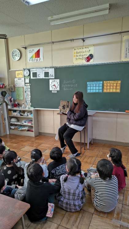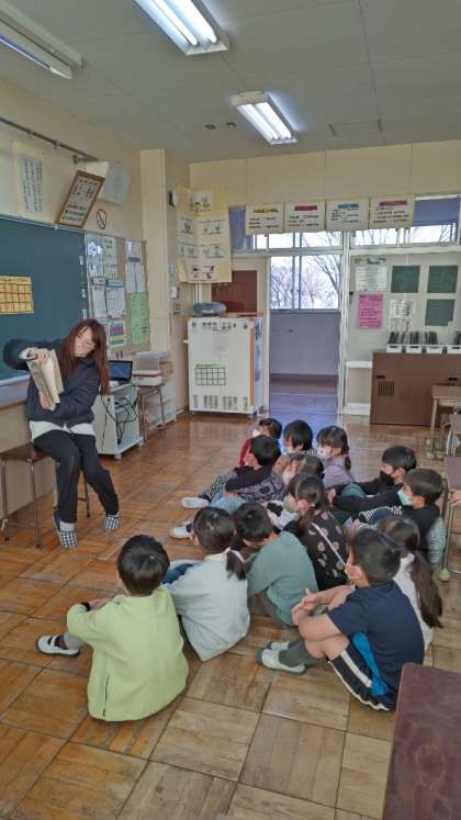 今朝は図書ボランティアの方々による1〜3年生の読み聞かせです。みんな教室の前に集まって始まるのを待っています。