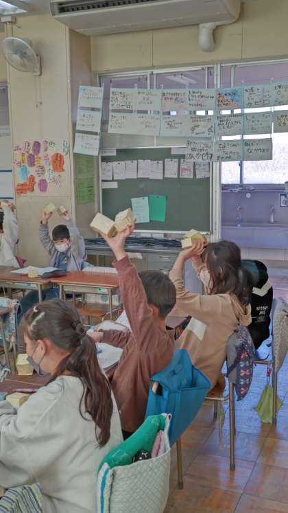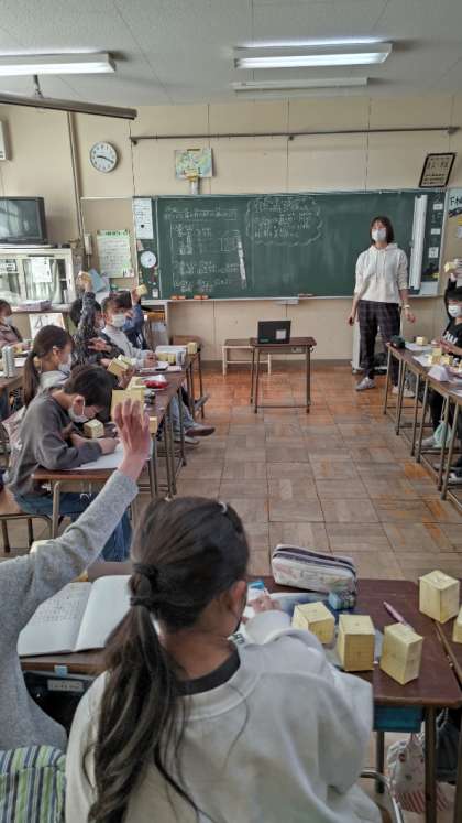 (ではみんなの机の上にある立方体はどれですか?直方体はどれですか?)