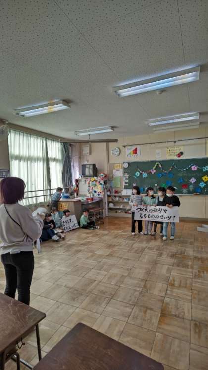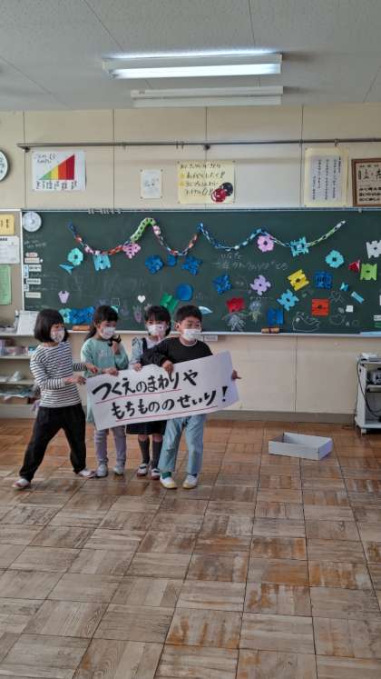[1年生生活]何やら発表の練習をしています。修了式の後に「春休みの生活について」全校に呼びかける発表の練習かな。