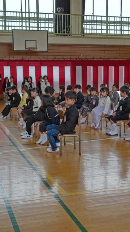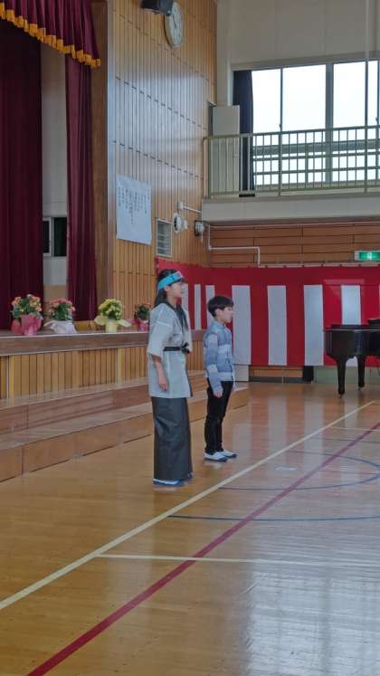 校長の話、教育委員会お祝いの言葉、祝電披露に続いて、6年生による歓迎の言葉です。下柚木小のマスコット「しもたろう」の姿です。