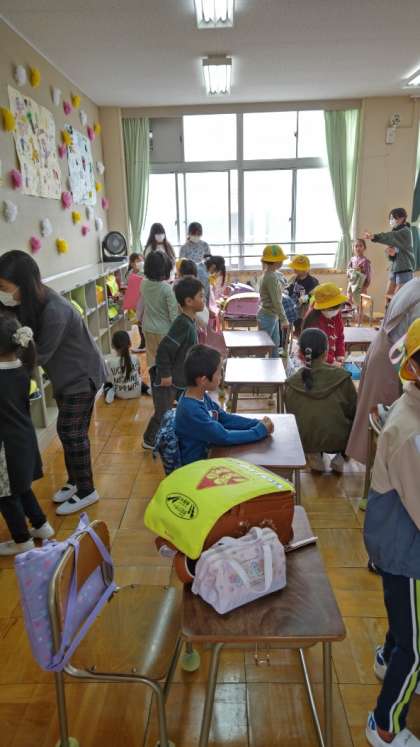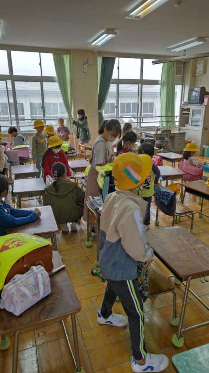 1年生が教室へ登校しました。早速6年生が朝の支度のお手伝いに来ています。優しく丁寧に、1年生に接している6年生です。