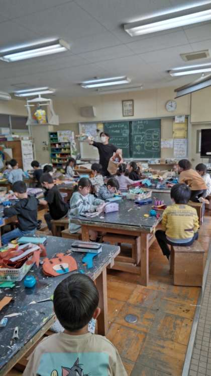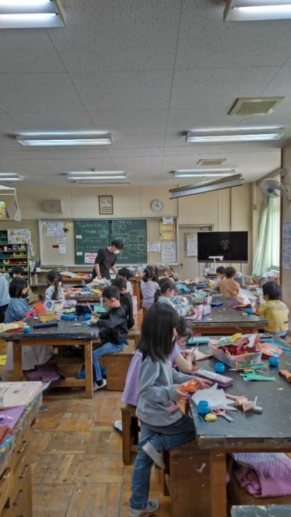 [2年生図工]「じゃばらカード入れ」を作っています。色画用紙を「じゃばら」にしてオリジナルカード入れを作ります。