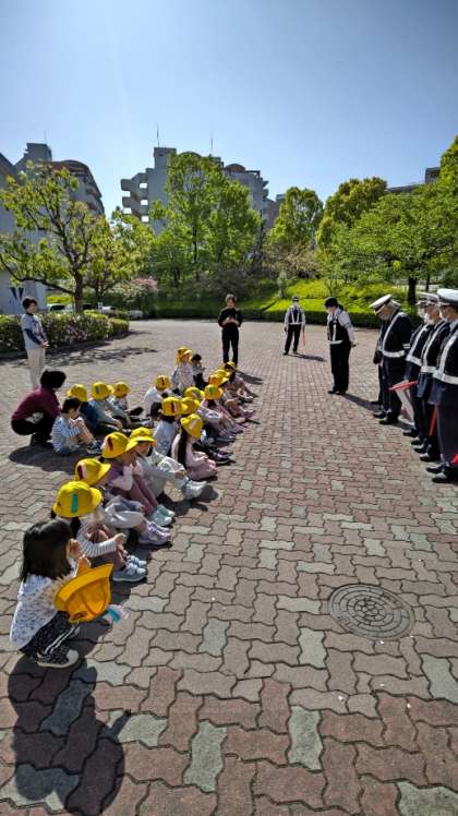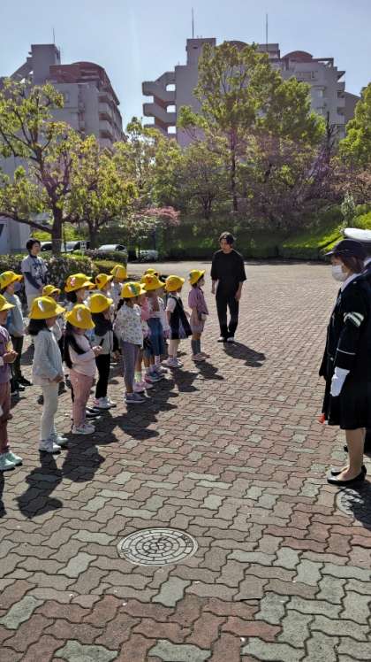 (道路の渡り方を教えてくれる警察の方々にご挨拶)