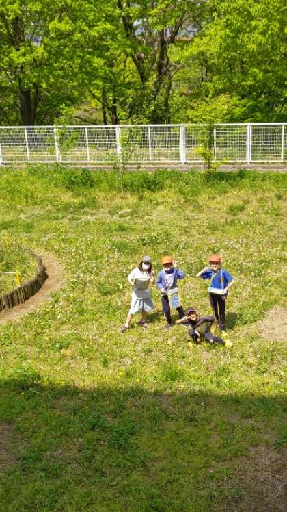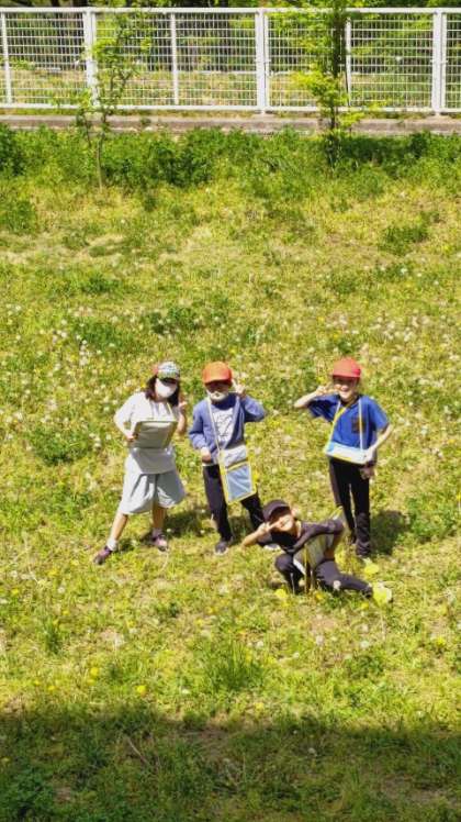 [4年生理科]廊下に出たら、ボードを手に裏庭を散策する4年生に気が付きました。窓を開けると「校長先生!」と言ってポーズを決めてくれました。