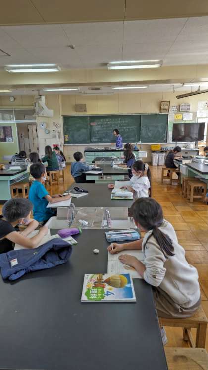 [4年生理科]校庭です調べた生き物の様子を振り返ります。下柚木小には、たくさんの生き物がいましたね。