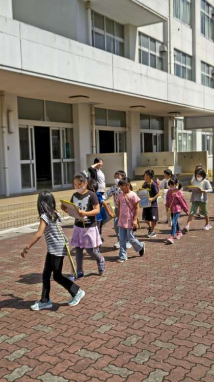 (まちたんけん日和の中、さあ出発します)