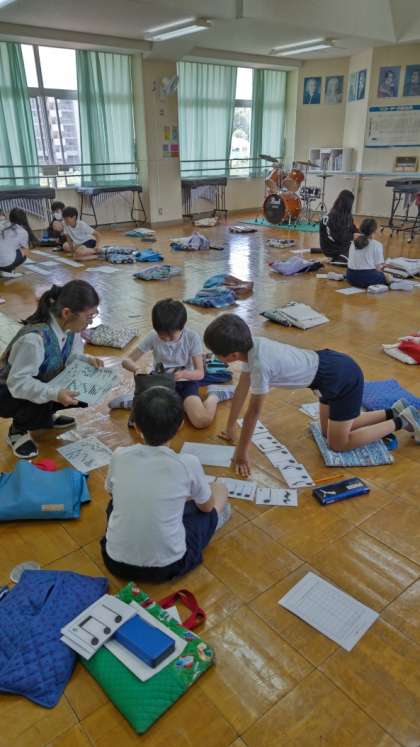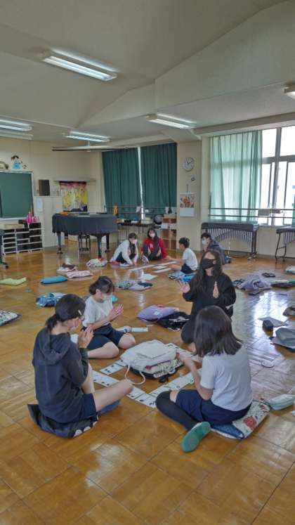 [6年生音楽]グループごとにつくったリズムパターンを、4人で重ね方を工夫しながら練習しています。
