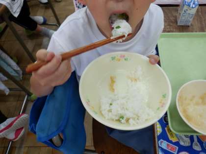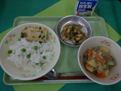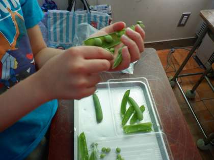 *今日は、2年生がグリーンピースのさやむきをしたものを給食で作り、全校児童で食べます。旬のグリンピースのにおいを嗅いだりしながら、むきました。自分でむいたものは格別です。「おいしい!」と口々にいっていました。頑張って食べて好きになってほしいです。