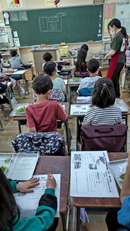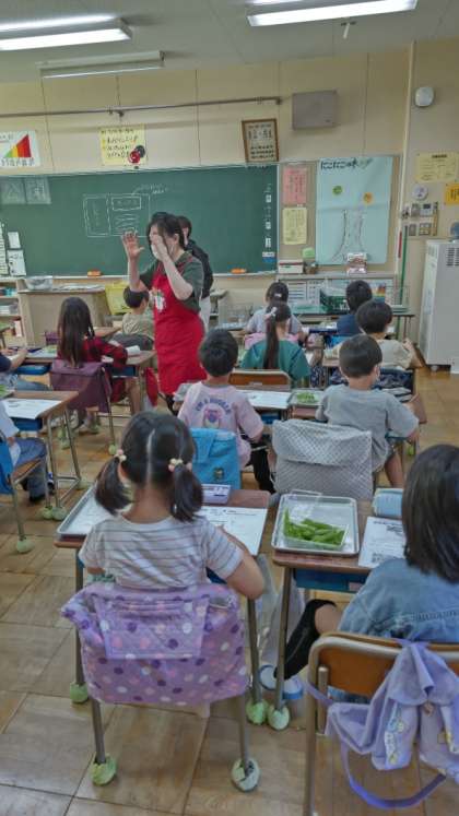 「グリンピースのさやむきたいけん」を2年生がしています。今日の給食は「グリンピースごはん」です。2年生のむいたグリンピースが使われます。