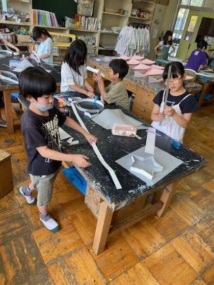 細長く切られた工作用紙を使って、自分で決めた形を作っていました。