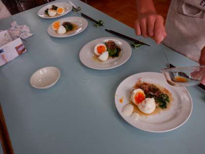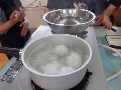 *5年生が、3,4校時に小松菜とゆでたまごを作りました。