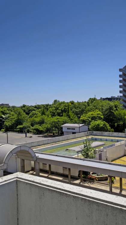 よく晴れて下柚木の緑が青空に映えます。来月からの水泳指導に備えて、プールは水抜きをしています。今週、プールの清掃があります。