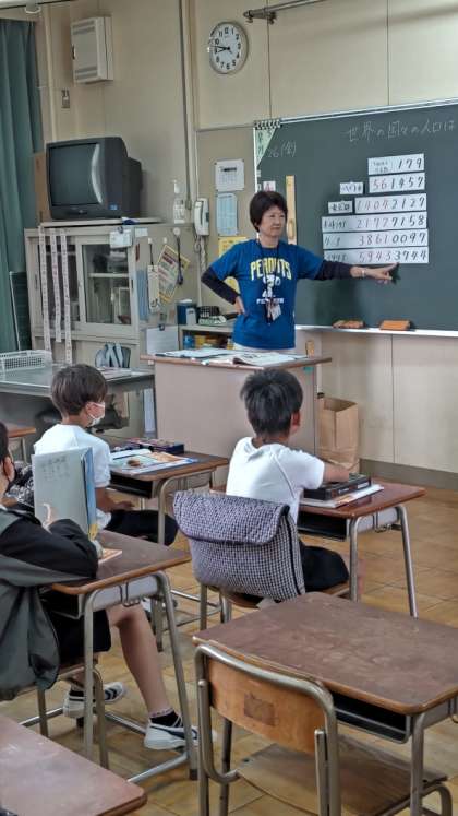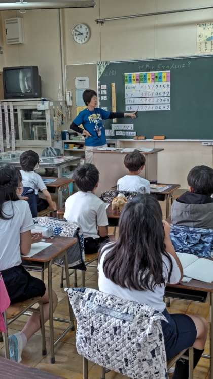 (世界の国々の人口を、先生が数字で示してくれます。さあ読めるかな?)