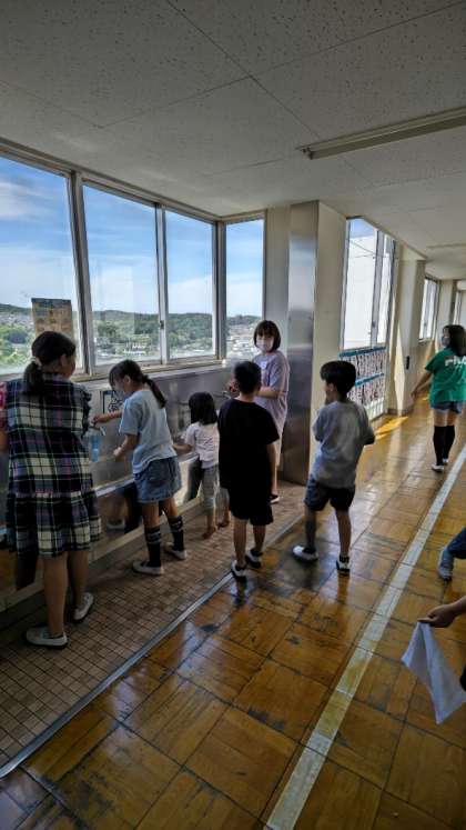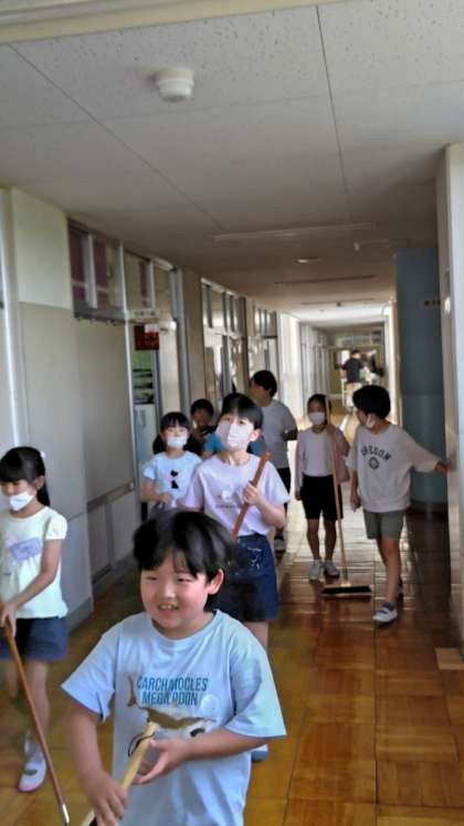 (1年生から6年生が、いつもたてわり班で集まる教室を一緒に掃除します)