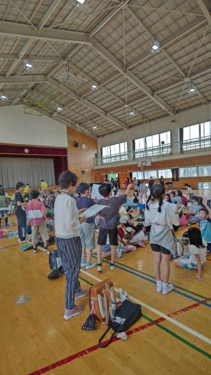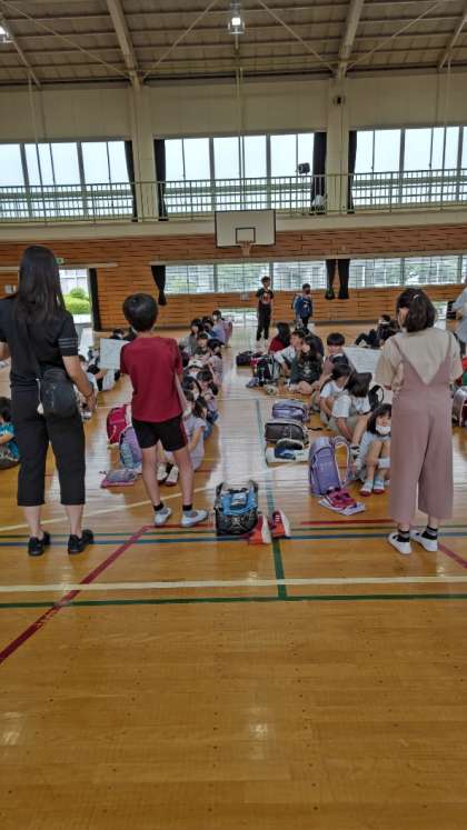 (6年生たちが各班を並ばせて、素早く出欠確認をします。毎年6年生ががんばってくれます)