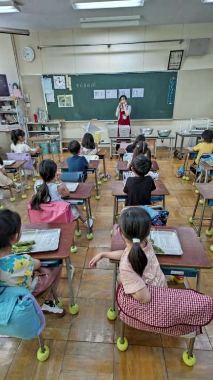 1年生の教室で栄養士さんがお話をしています。そうです。今日は、1年生が給食のお手伝いをする日です。