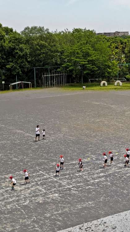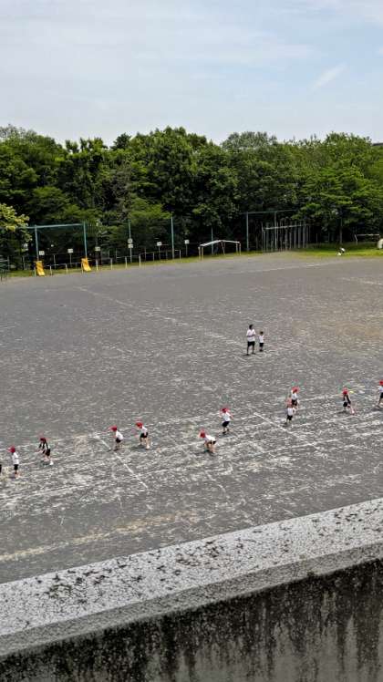 [1年生体育]1年生が広い校庭で体育をしています。今月、行われる体力テストの練習かな。「反復横跳び」をしています。