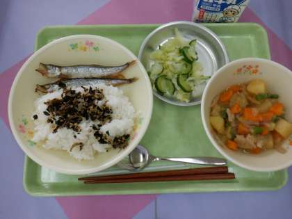 *今日は、体力テストがありました。ししゃもは、頭からしっぽの骨まで全部食べられるので、カルシウムが豊富です。「ししゃもは体を作るよ!」と担任の先生が話してくれました。写真2枚目。