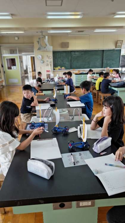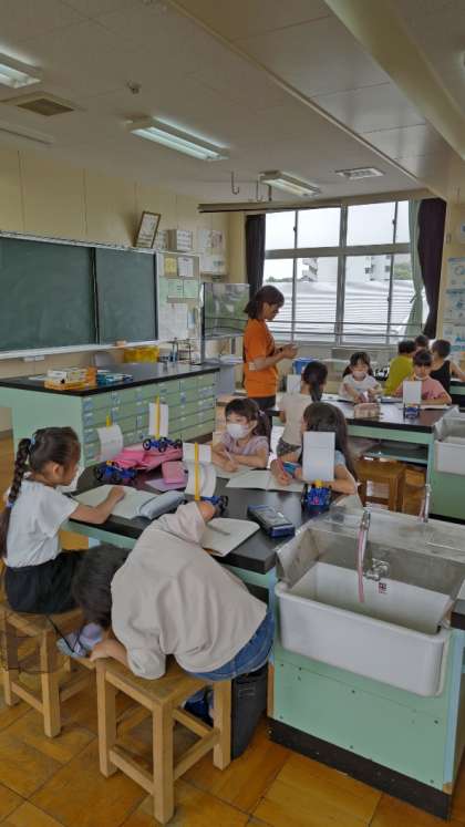 [3年生理科]3年生が理科室で学習中です。机の上に、楽しそうな実験道具がありますね。何の実験をするのかな。