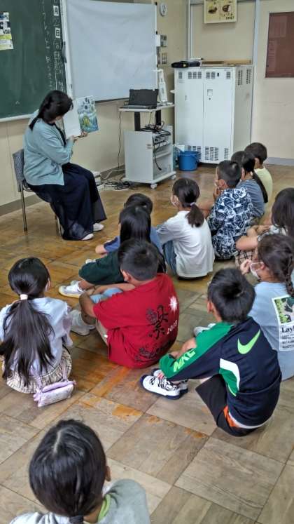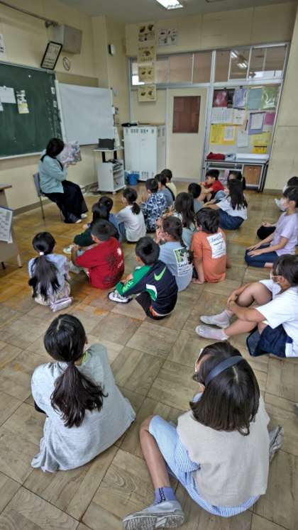 8:25より図書ボランティアの方々による読み聞かせがあります。今日は全学年です。机を下げてボランティアの方をお待ちします。