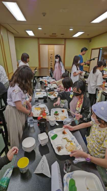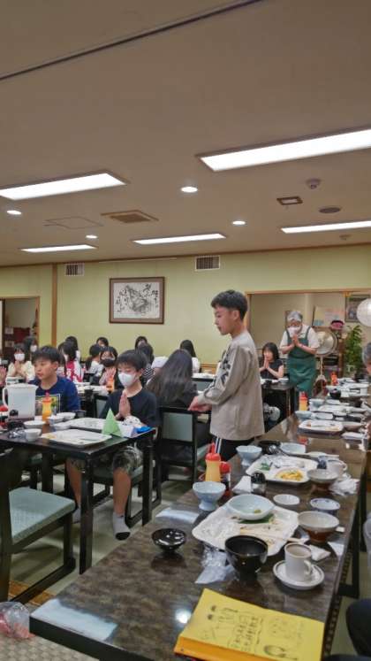 18:40 「ごちそうさま」をしたら、近くの人と協力して片付けをします。残したものを集めます。