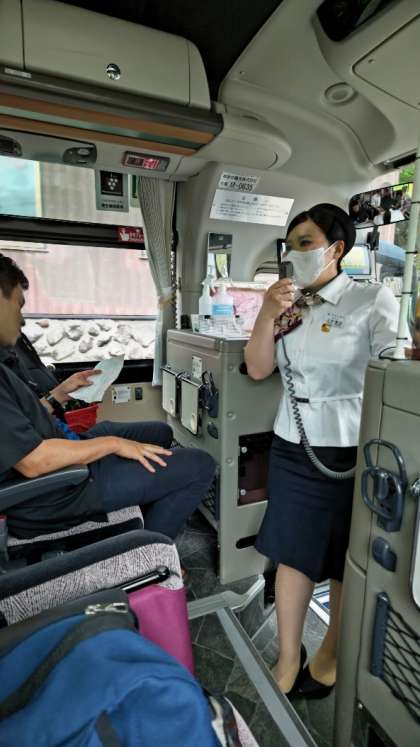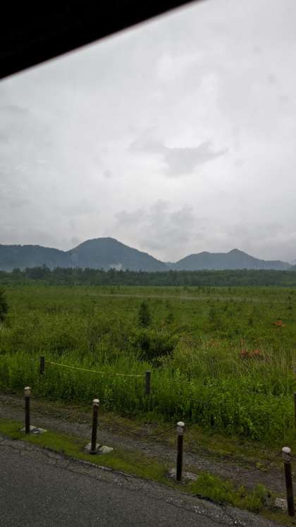 (ガイドさんが、日光のことをいろいろ教えてくれました。窓から昨日歩いた戦場が原が見えます)