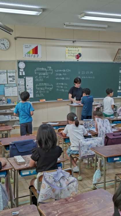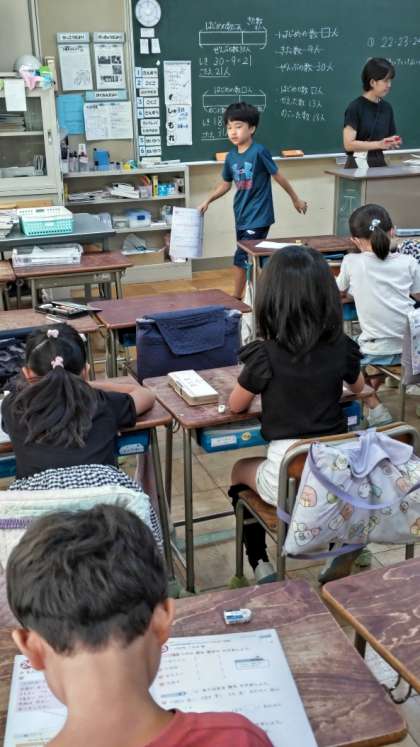 (そしてテープ図を書いて、たし算なのか、ひき算なのか考えます)