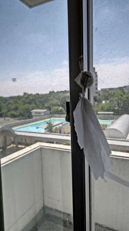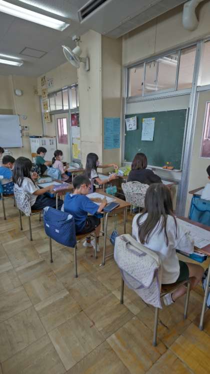 (教室の窓にてるてる坊主。「プールに入れますように」かな)