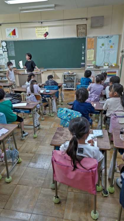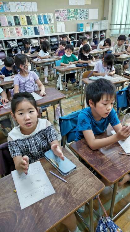 [2年生生活]「生きもののことをつたえよう」です。裏庭や中庭で捕まえてきた虫を観察して、カードに書きます。