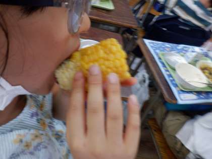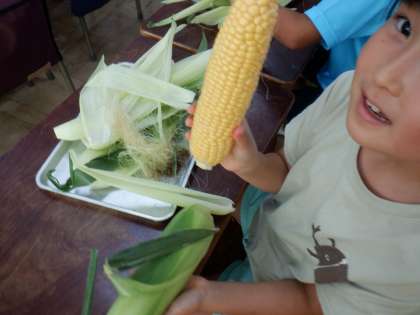 *今日は、八王子産の朝採れたとうもろこしを3年生が皮むき体験しました。