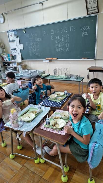 [1年生給食]週の始まり、月曜日です。先週末の2年生に続いて、今日は1年生の給食風景です。