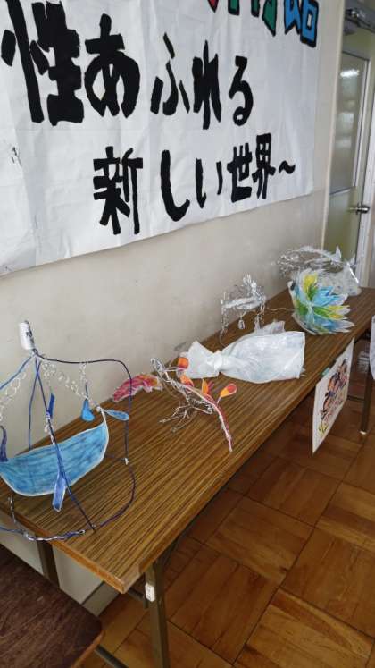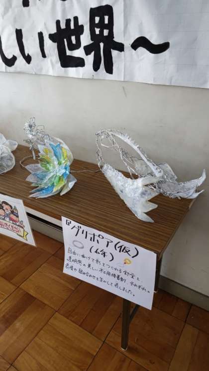 下柚木美術館(職員室前ミニギャラリー)の展示が6年生の作品に替わりました。「グリポア(仮)」というそうです。