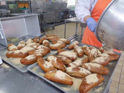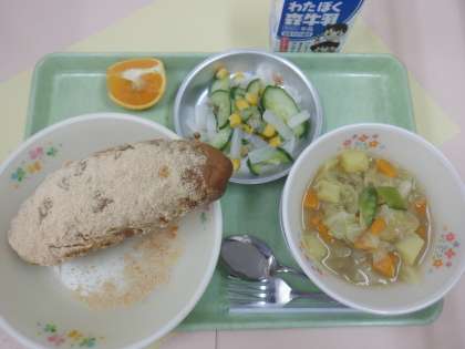 *9月(く)8日(わ)は語呂合わせで桑の日です。八王子は桑の都と呼ばれていました。今日は、桑の葉粉を混ぜて焼いたパンで、きなこ揚げパンを作りました。