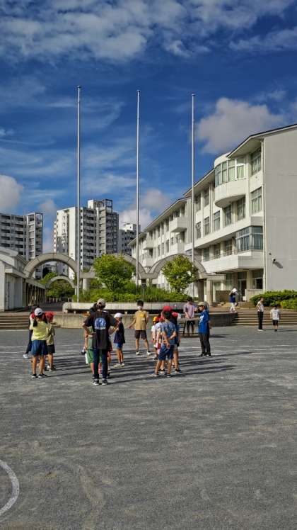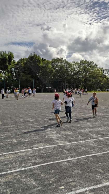 (子供たちが校庭に集まってきました。まだそれほど暑くはない時間です)