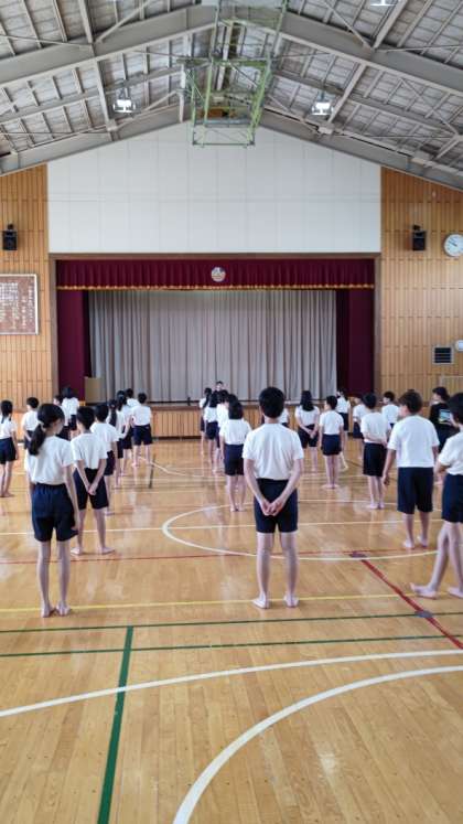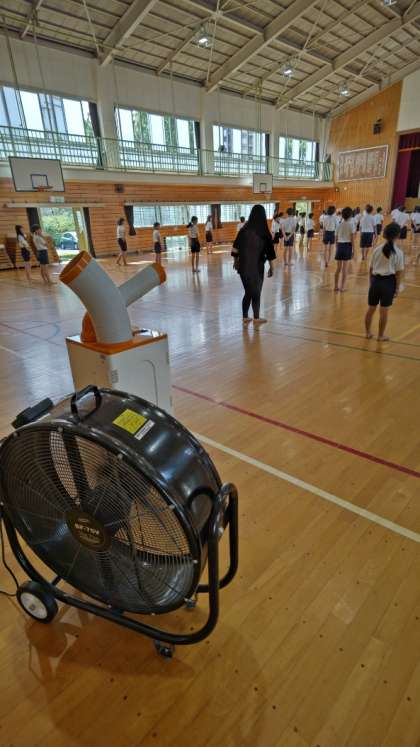 [5年生6年生体育]いよいよ運動会へ向けてソーラン節の練習開始です。体育館ではスポットクーラーと巨大扇風機2台が稼働中です。