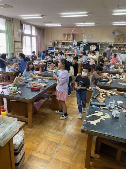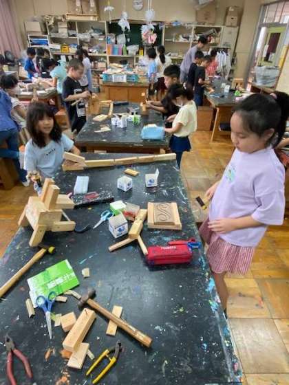 「くぎうちトントン」金づちとくぎを使って、木をつなぎ合わせていきます。